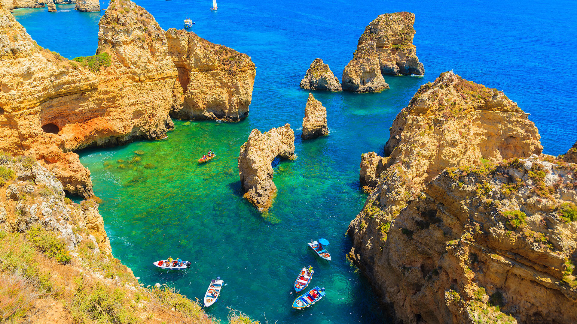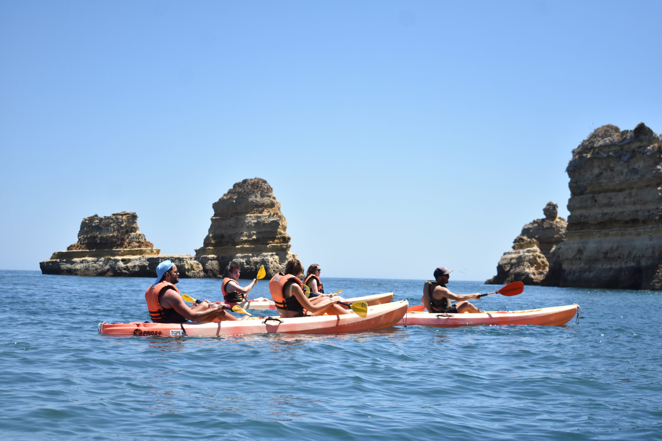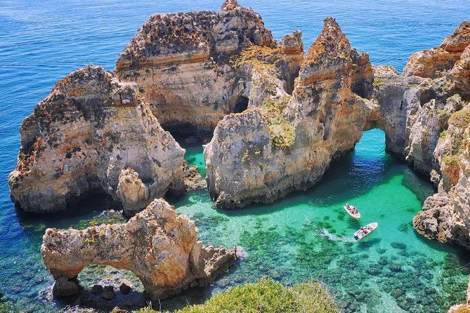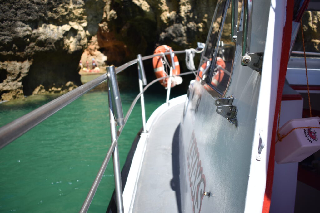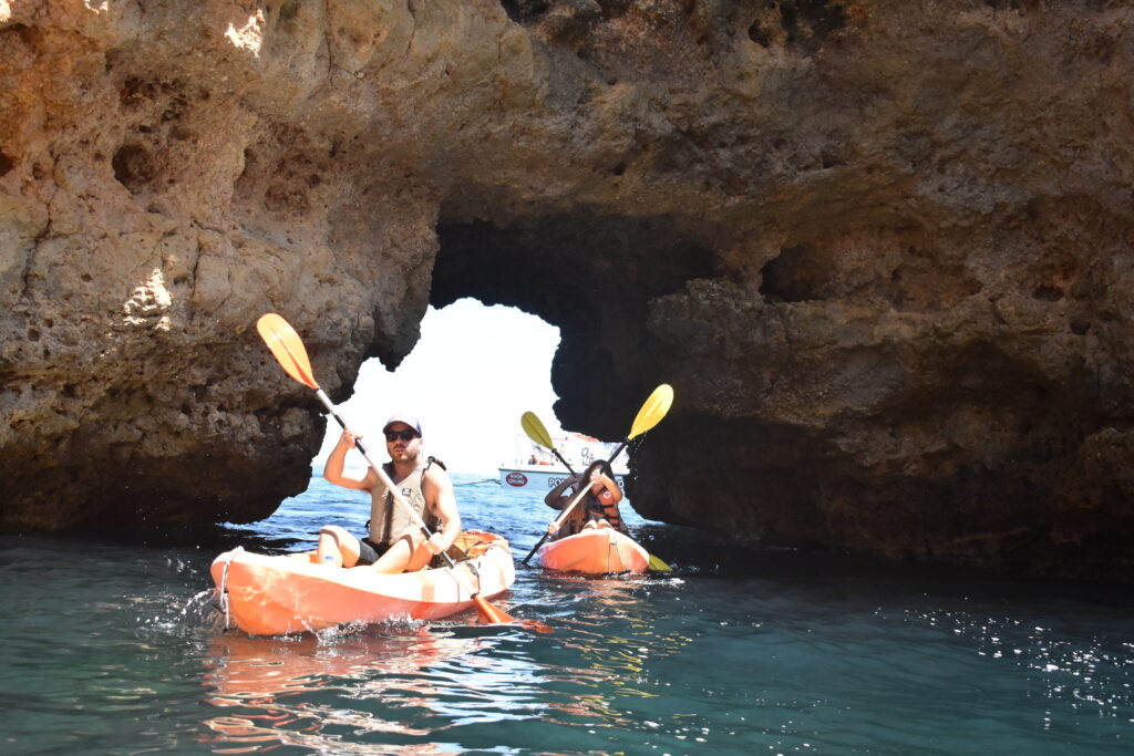 Após encontrar o melhor local para colocar os kayaks e os passageiros na água, o barco de apoio acompanhará a aventura de kayak à distância pelas pequenas e grandes grutas da Ponta da Piedade, garantindo sempre a segurança de quem escolhe a Ponta da Piedade Tours para estes momentos.